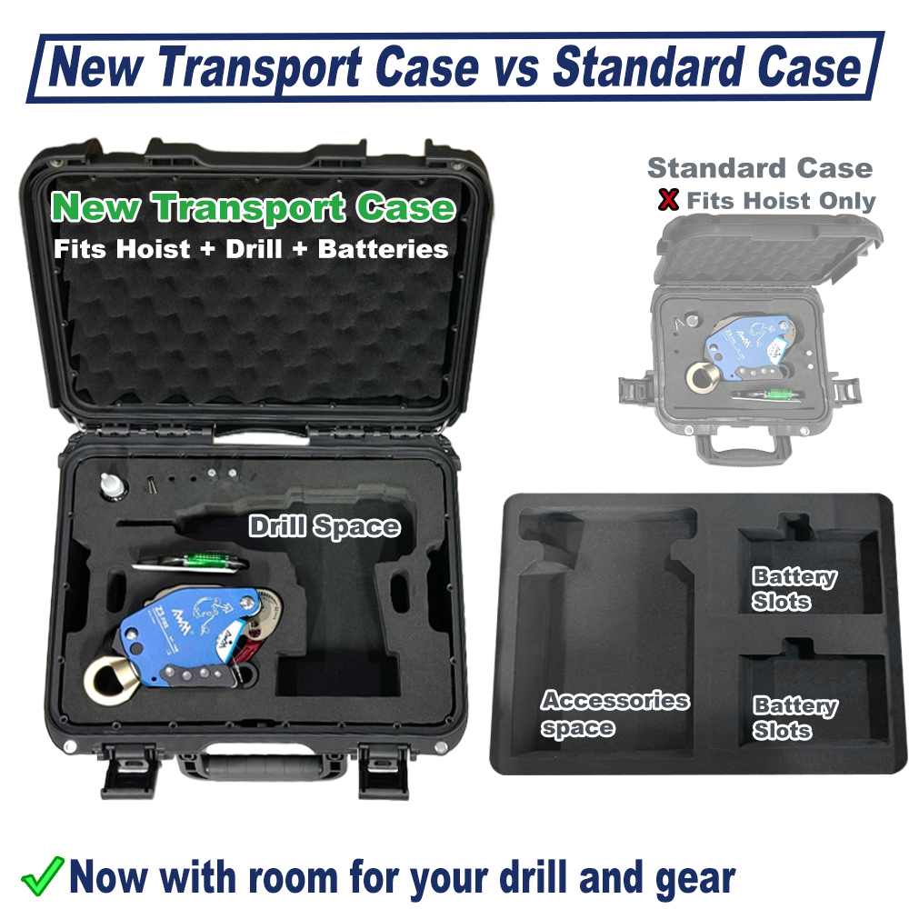 La mallette offre suffisamment d’espace pour accueillir l’appareil, une perceuse sans fil (pour alimenter le treuil), deux batteries et les accessoires essentiels.
